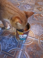 Er kann es kaum abwarten, bis die Bio-Ente im Schälchen ist... Mit einem zufrieden Schnurren und Schmatzen vertilgt er die lecker Ente.